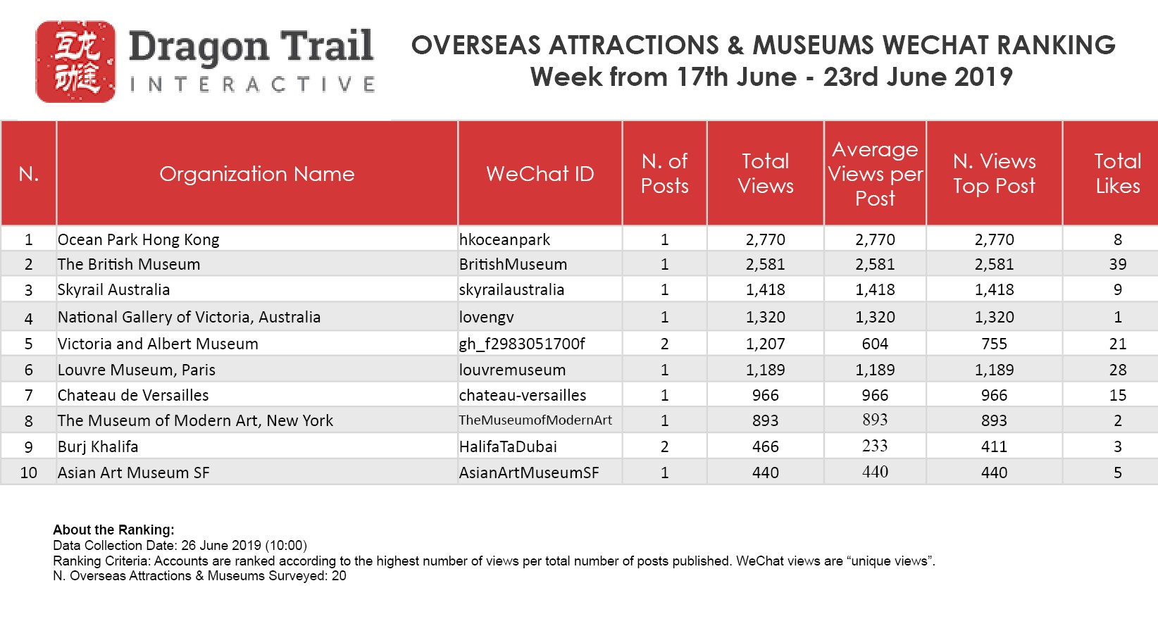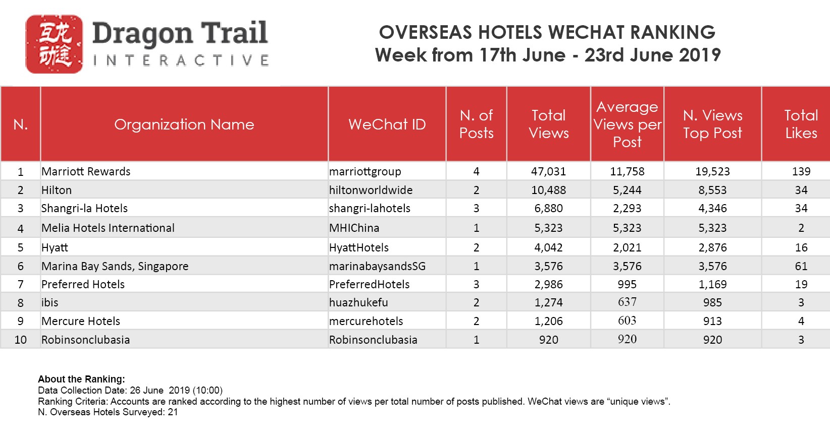 The top-ranking WeChat accounts for travel destinations, airlines, cruise lines, museums & attractions, and hotels, for the week of 17-23 June, 2019.
