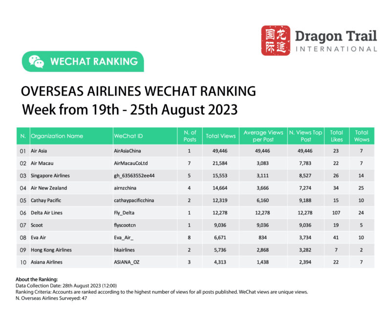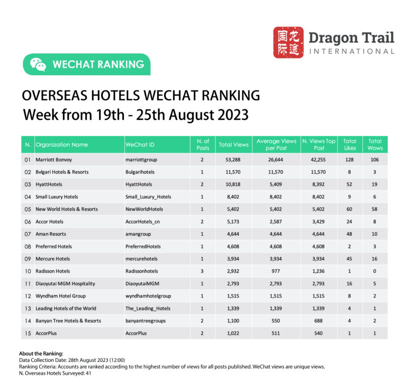 The top-ranking WeChat accounts for travel destinations, airlines, cruise lines, museums & attractions, and hotels, for the week of 19-25 August 2023.