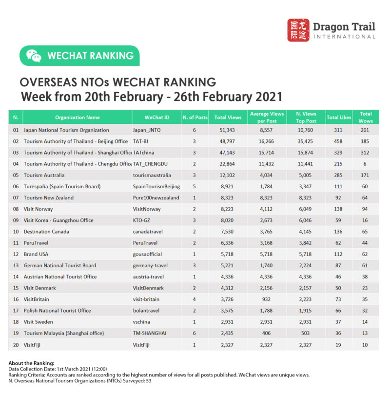 About the data: The data is jointly collected and compiled by Dragon Trail Interactive and Dingla, a B2B travel marketing platform assisting foreign organizations to build long term travel trade relationships in China.
