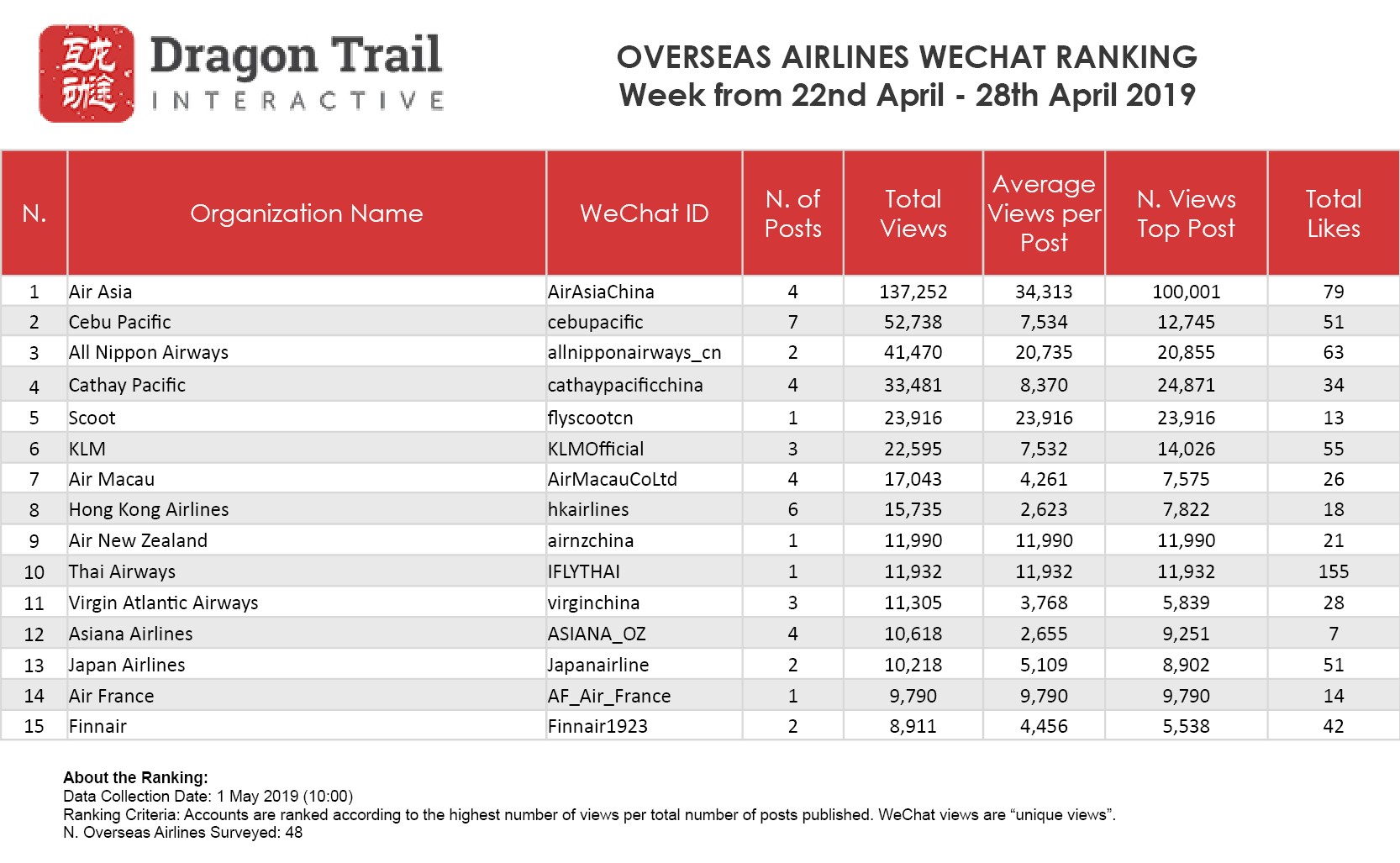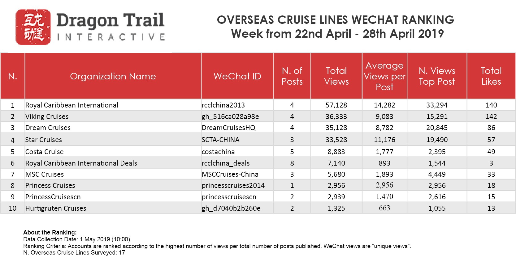 WeChat Weekly Rankings: Destinations, Airlines, Cruises, Attractions and Hotels – 22 April – 28 April 2019