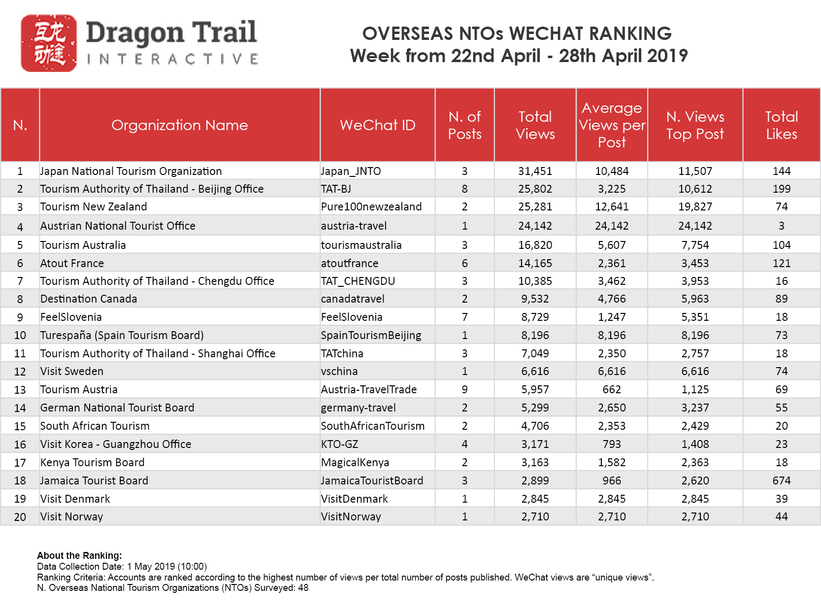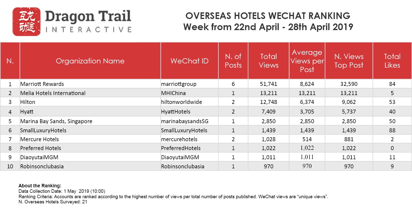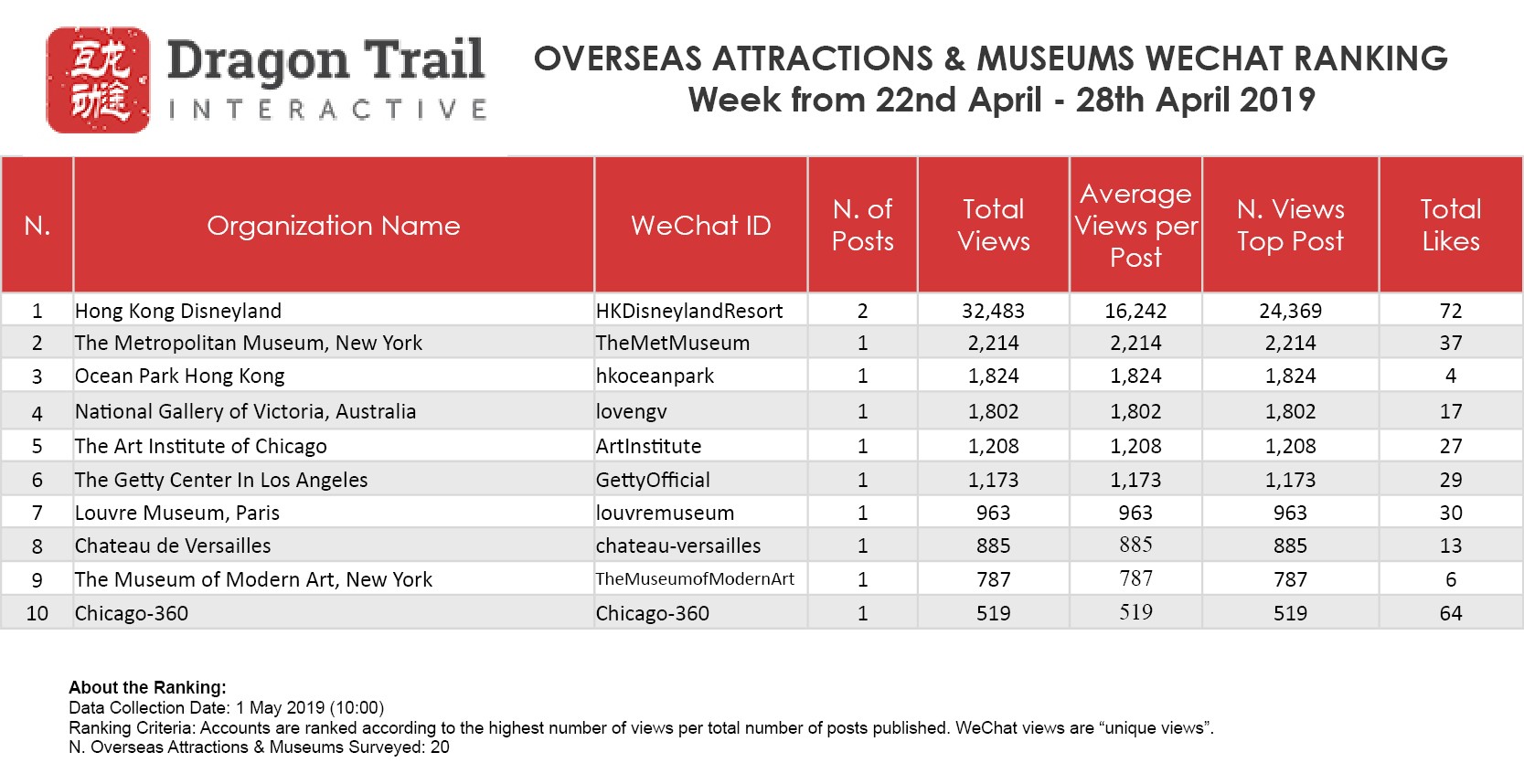 The top-ranking WeChat accounts for travel destinations, airlines, cruise lines, museums & attractions, and hotels, for the week of April 22 - April 28, 2019.