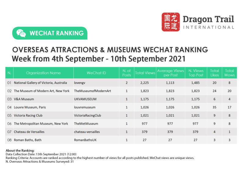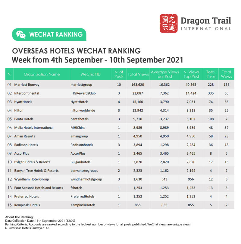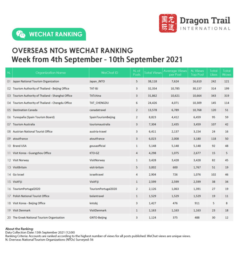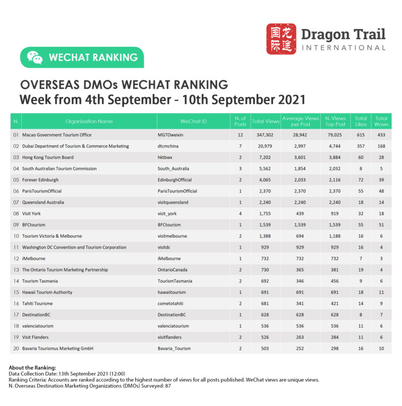The top-ranking WeChat accounts for travel destinations, airlines, cruise lines, museums & attractions, and hotels, for the week of 4-10 September 2021.