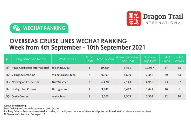 WeChat Weekly Rankings: Destinations, Airlines, Cruises, Attractions and Hotels – 4-10 September 2021