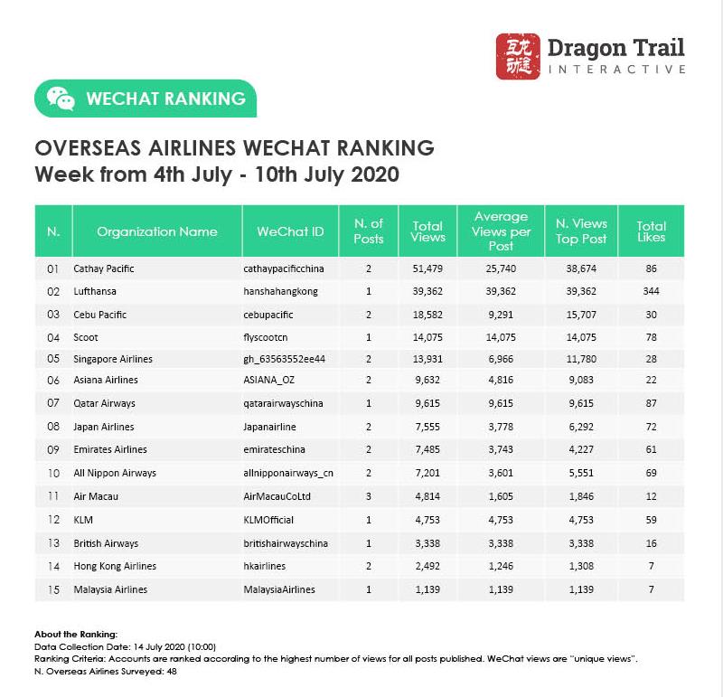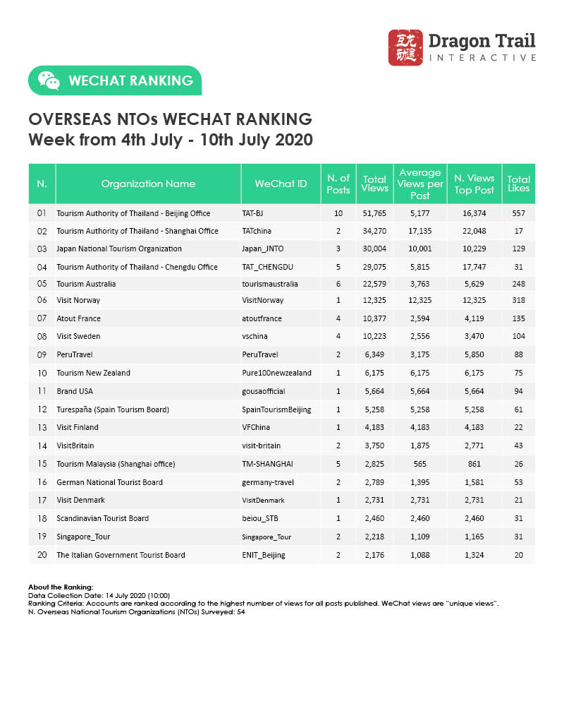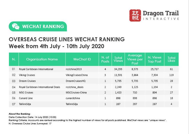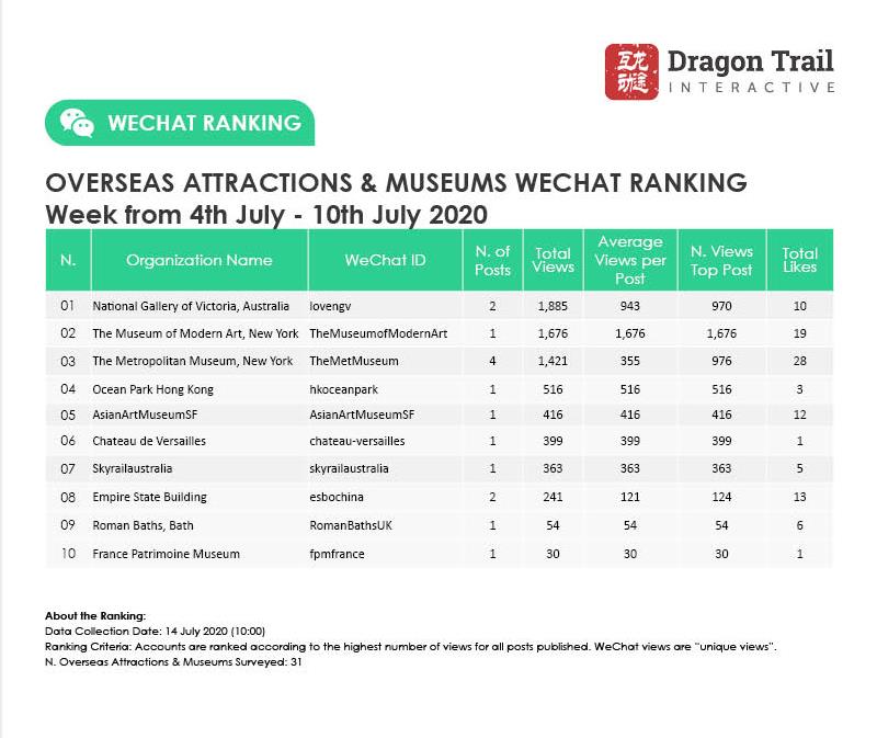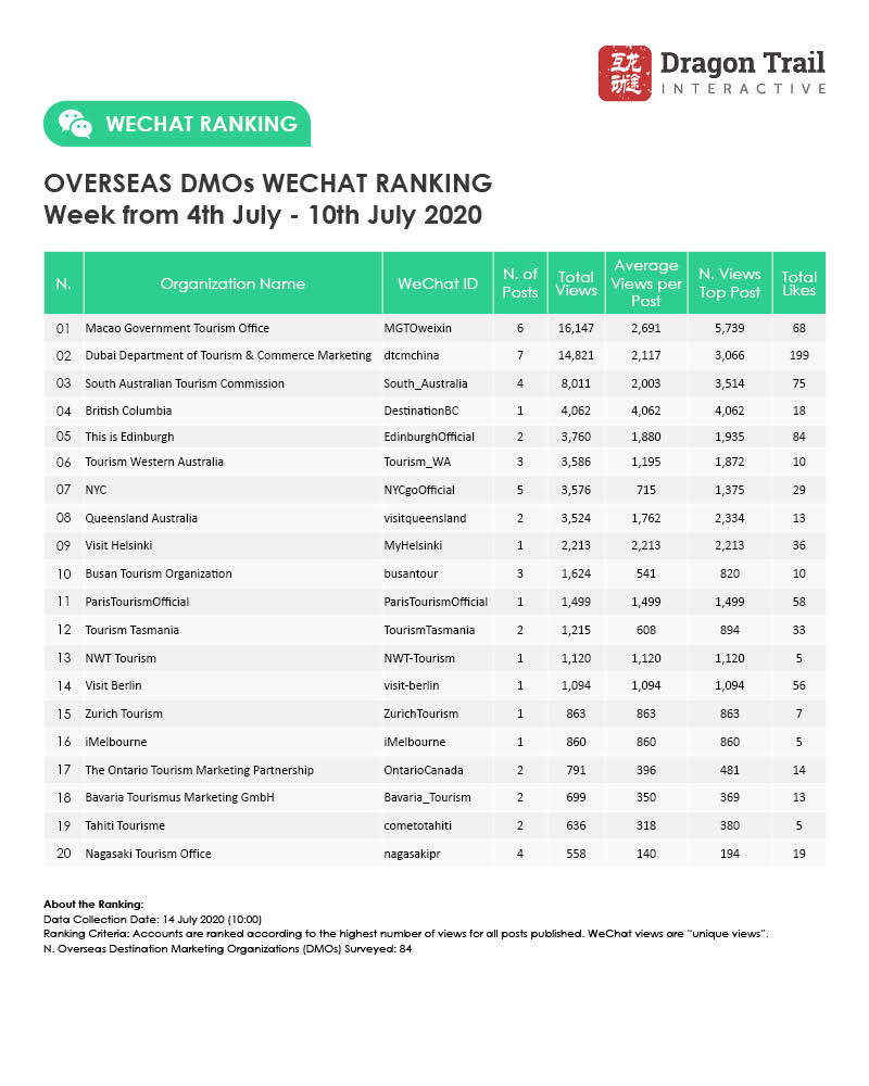 The top-ranking WeChat accounts for travel destinations, airlines, cruise lines, museums & attractions, and hotels, for the week of 4 July - 10 July, 2020.
