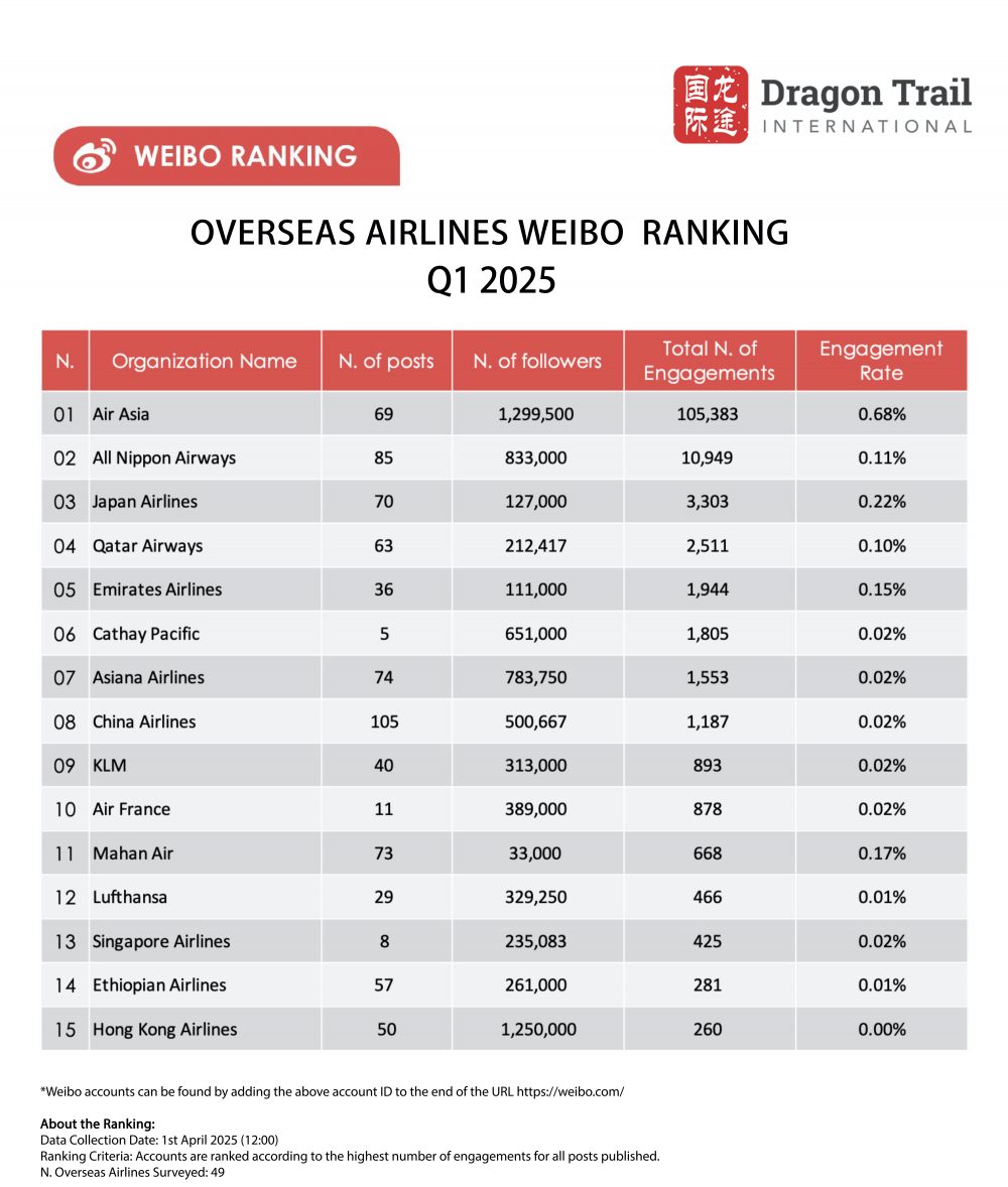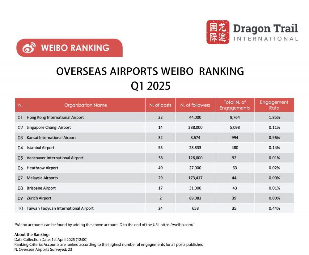 Dragon Trail International’s Weibo Rankings Report tracks and analyzes performance for national tourism organizations (NTOs), destination marketing organizations (DMOs), airlines, airports, cruise lines, museums & attractions, and hotels. Our quarterly Weibo reports build industry benchmarks and uncover best practices in digital marketing in the travel sector.
