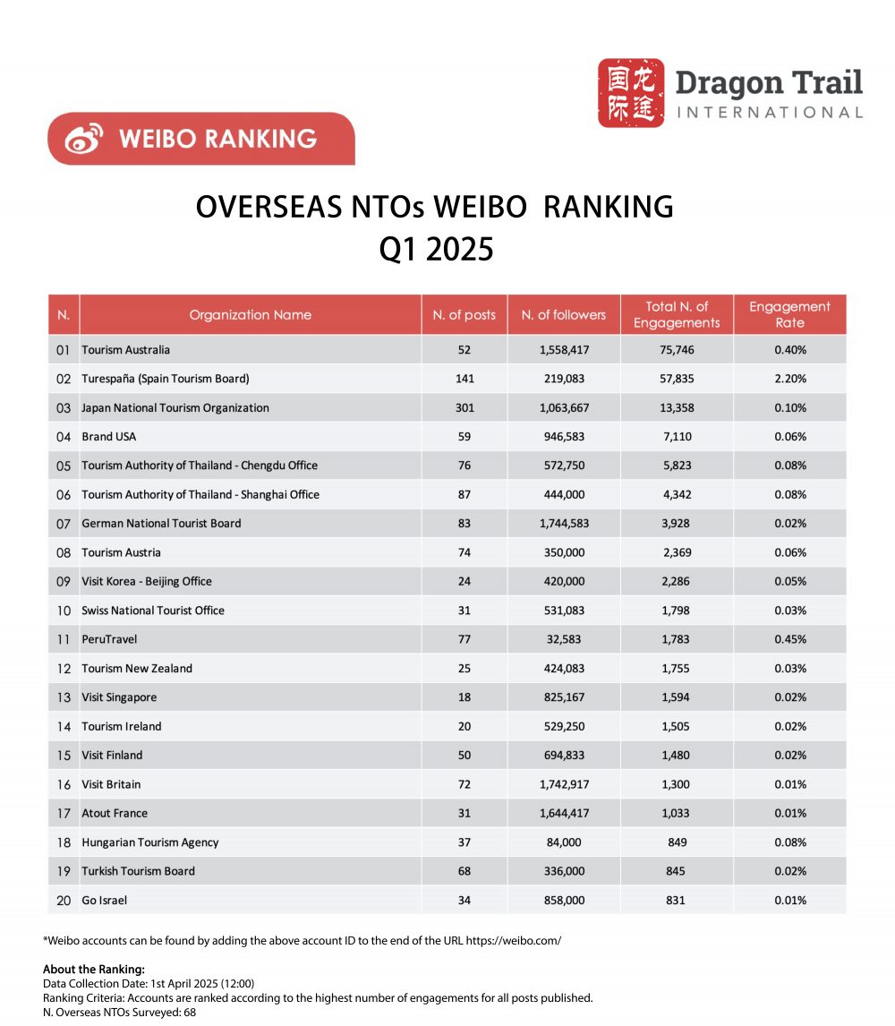 The top-ranking NTO accounts in Q1 2025 differed significantly from those in Q1 2024, which had featured four European NTOs in the top five. In Q1 2025, Tourism Australia led the ranking with 75,746 total engagements, accounting for 38.96% of all engagements. It was followed by the national tourism boards of Spain, Japan, the United States, and the Tourism Authority of Thailand (TAT) – Chengdu Office. Notably, Tourism Australia rose from 10th place in Q1 2024 to 1st place in Q1 2025, representing a 1,341% increase in total engagements.