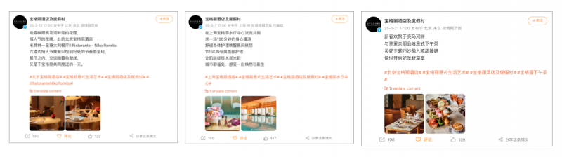 The most engaged post came from Marriott Bonvoy, featuring a photo of international supermodel Xiaowen Ju at a Marriott Hotel, along with a hyperlink encouraging users to explore Marriott properties across China. The next six most popular posts were all from Bvlgari Hotels, highlighting its Michelin-starred restaurant, luxurious spa treatments, elegant afternoon teas, and promotional teaser videos. This trend underscores the importance of celebrity collaborations, as accounts without such content saw significantly lower engagement levels, illustrating the vital role of a strong fan base on Weibo.