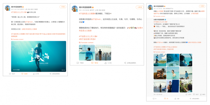 The most popular post in Q1 2025 came from Tourism Australia and featured a vlog by actor Yu Shi (Yosh) documenting his trip to Queensland. The post received 60,864 engagements and included the hashtags #于适的昆士兰假期 (Yosh’s vacation in Queensland) and #和于适在澳大利亚 (With Yosh in Australia), which together generated over 14.57 million views and 771,000 discussions on Weibo. Tourism Australia’s collaboration with Yosh and their frequent related posts drove significant engagement throughout the quarter. The second and third most popular posts were both from the Spain Tourism Board, featuring content about hidden gems in southern Spain’s Andalusia region—highlighting unique towns and regional cuisine—and a vlog from actor Li Xian documenting his second trip to Spain, respectively.