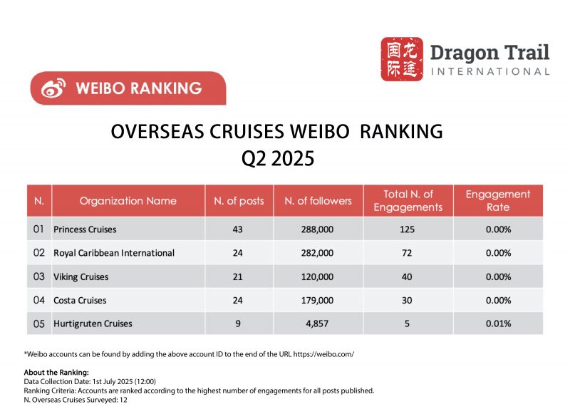 Cruise accounts continued to generate very low engagement in Q2 2025, similar to Q1, with the most-liked post receiving only 43 likes. The active accounts remain unchanged from the previous quarter, with Princess Cruises leading in both activity and engagement. Its top two most-liked posts were both fan giveaways, offering up to $600 in onboard credit and up to $500 in instant savings. Other posts mainly consisted of videos highlighting cruise facilities, onboard activities, room tours, and promotional content featuring celebrities and influencers. While fan giveaways and celebrity-related content often perform well in categories such as NTOs or DMOs, cruise accounts on Weibo still underperform significantly in comparison.