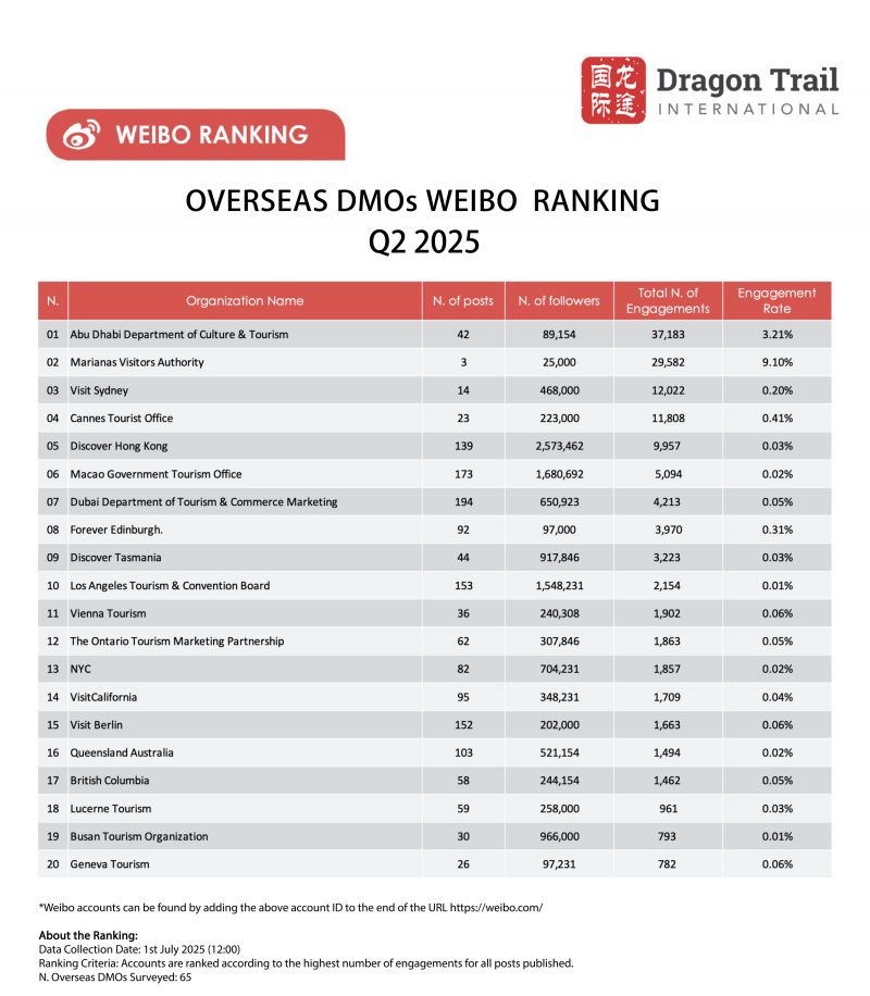 Another highly engaging post came from the Marianas Visitors Authority, announcing the appointment of Zheng Yecheng as Honorary Saipan and Marianas Wellness Ambassador. As of July 20th, this post had received more than 31,309 engagements. Abu Dhabi’s post featuring Liu Yifei—showcasing her summer travel experience in Abu Dhabi—was the second most-liked post in the DMO category.