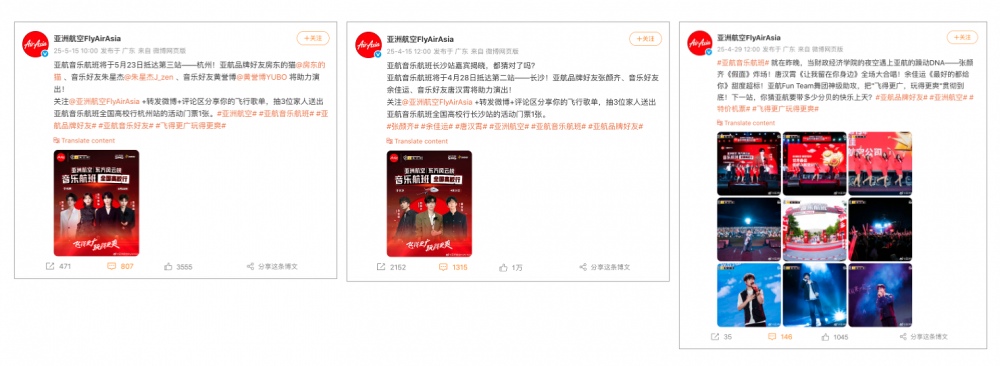 Eight of the top 10 most-liked Weibo posts in the airlines category were from AirAsia, featuring celebrity-related content involving its “Brand Friends” and “Brand Music Friends,” along with recommended itineraries and event recaps. Notably, in 2025, AirAsia launched an innovative marketing campaign titled “AirAsia’s Music Flight”, combining air travel with live campus music performances. Under the slogan “Fly Further, Play Harder,” the campaign featured “Brand Music Friends” such as Zhang Yanzhi, Zhu Xingjie, and The Landlord’s Cat, who performed at universities in cities including Chengdu, Changsha, and Hangzhou.