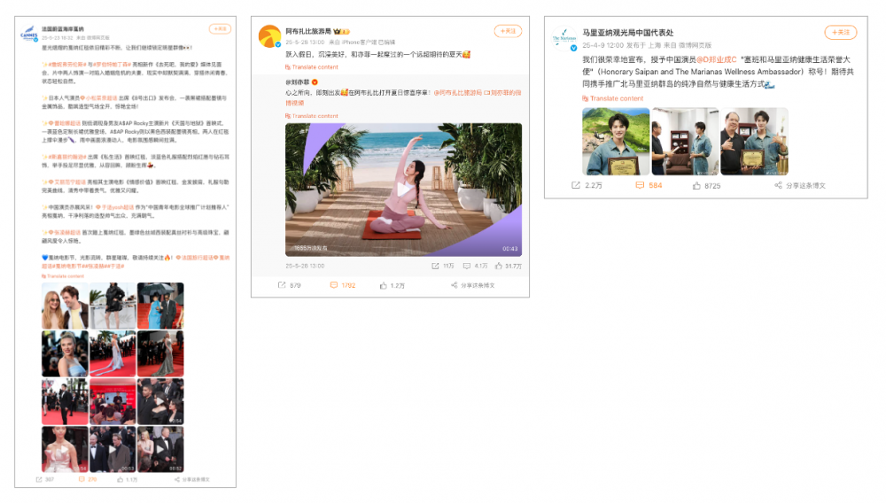 The most-liked post of the quarter came from the Cannes Tourist Office. The Weibo post featured a star-studded roundup of celebrity appearances at the Cannes Film Festival, highlighting red carpet moments, film premieres, and standout fashion. Featured celebrities included both international and Chinese stars such as Jennifer Lawrence, Rihanna, and Yu Shi.
