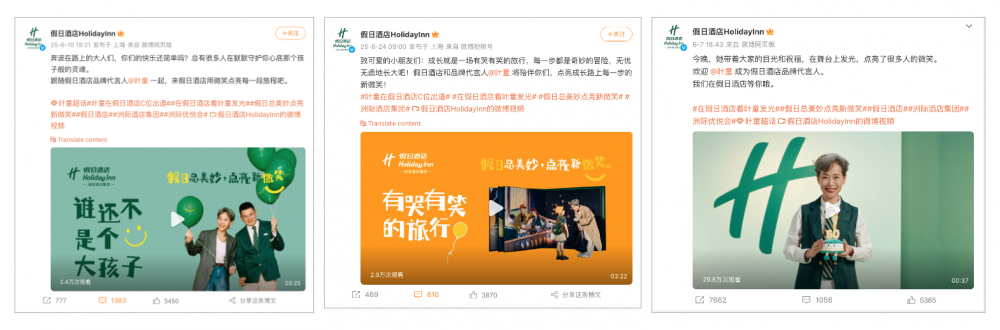 Marina Bay Sands’ most-liked post featured a surprise fan event with Liu Shishi and Zhang Yunlong during the overseas premiere of the drama series Love in Pavilion, which included exclusive fan interactions and ticket giveaways. Meanwhile, Holiday Inn’s popular posts focused on brand ambassador Cecilia Yip, sharing heartfelt messages that celebrated both the childlike spirit in adults and the joys of growing up. These posts reinforced the brand’s image as a warm and comforting presence throughout different stages of life.