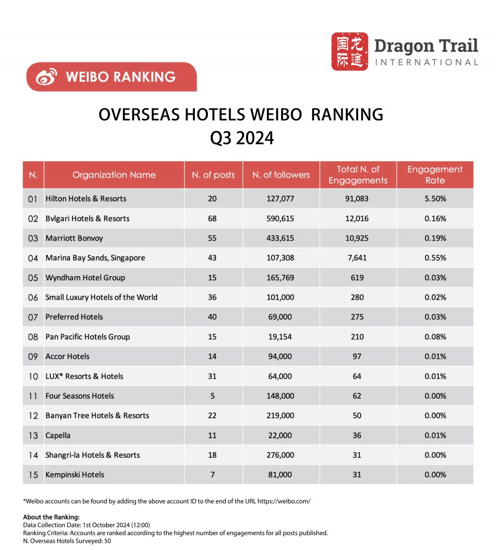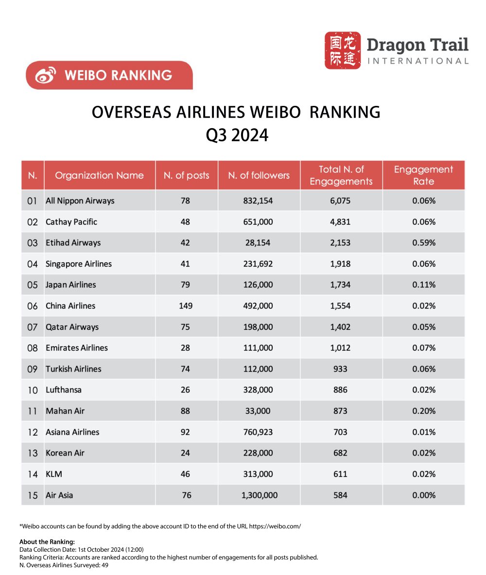 Dragon Trail International’s Weibo Rankings Report tracks and analyzes performance for national tourism organizations (NTOs), destination marketing organizations (DMOs), airlines, cruise lines, museums & attractions, and hotels. Our quarterly Weibo reports build industry benchmarks and uncover best practices in digital marketing in the travel sector.