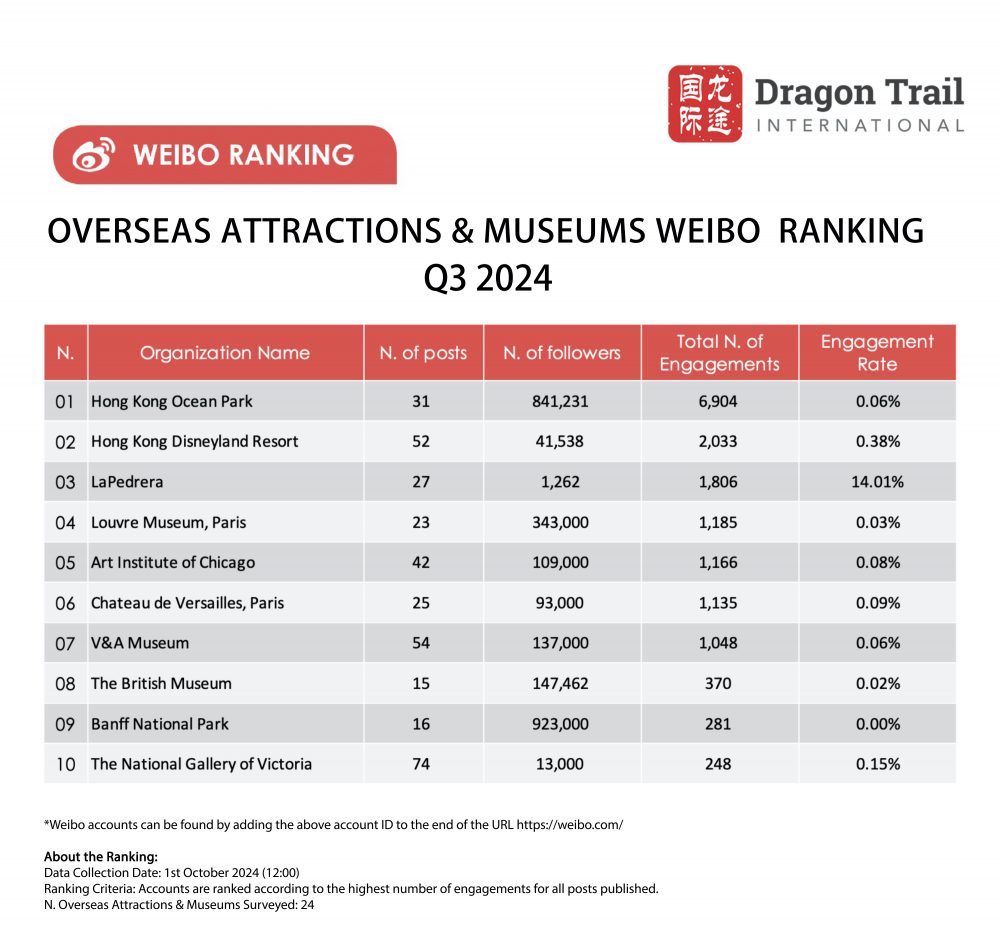 Hong Kong Ocean Park saw its engagement increase over threefold in Q3, rising to 1st place, followed by Hong Kong Disneyland Resort, La Pedrera, and the Louvre Museum. The park’s most popular post highlighted the excitement surrounding the birth of twin pandas An An and Ke Ke, garnering a total of 4,365 engagements. The account frequently shares updates on the six pandas residing at the park, such as Ying Ying’s exclusive sleeping cave and Le Le’s 19th birthday celebration, along with seasonal travel guides, holiday celebrations, and special events.