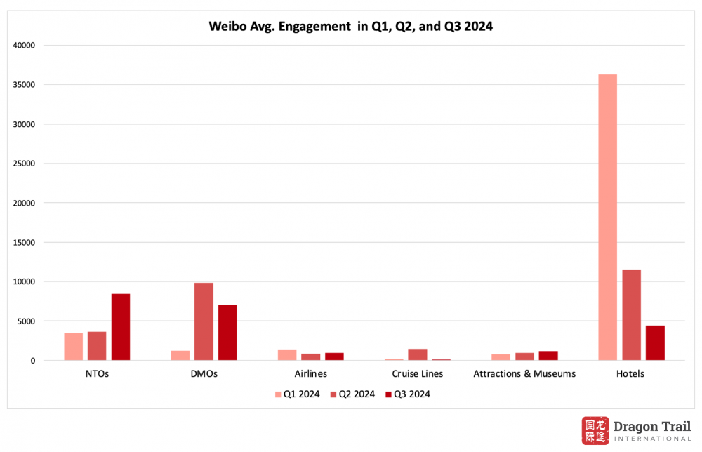 Celebrity-related content continued to drive engagement on Weibo in Q3 2024, with NTOs and hotels seeing strong results from influencer partnerships. While NTOs and airlines saw growth in the average number of engagements, DMOs, cruise lines, and hotels all experienced a decline.
