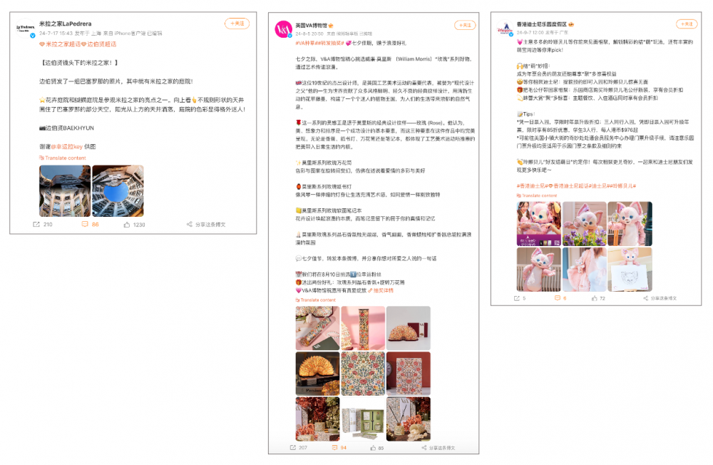 (Left to right) Weibo posts from La Pedrera, V&A, and Hong Kong Disneyland