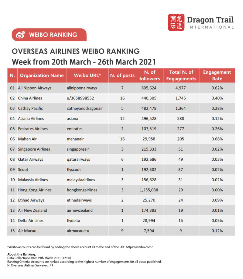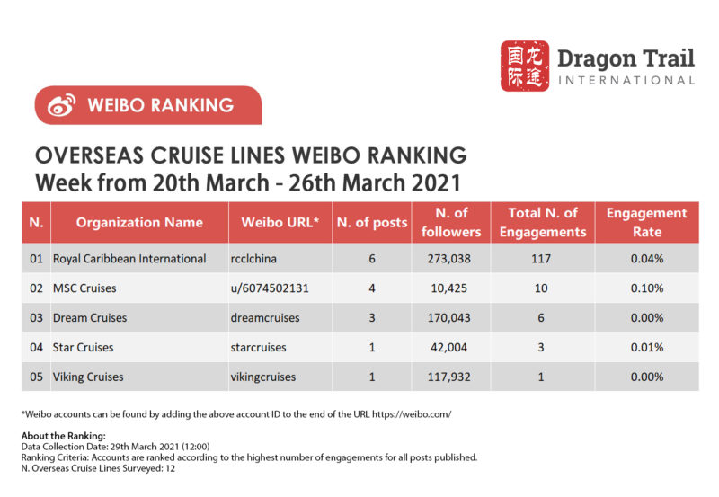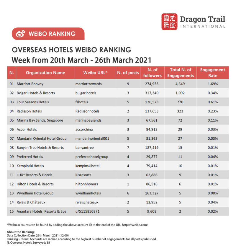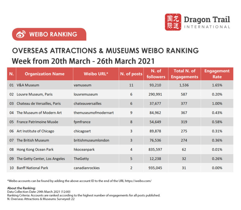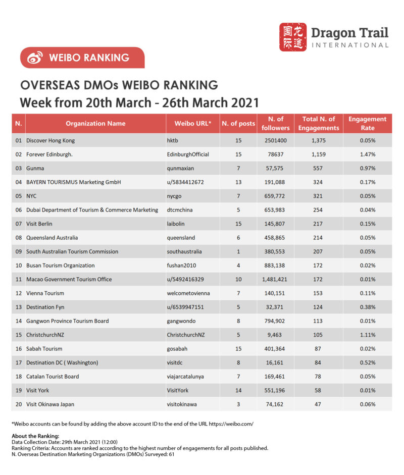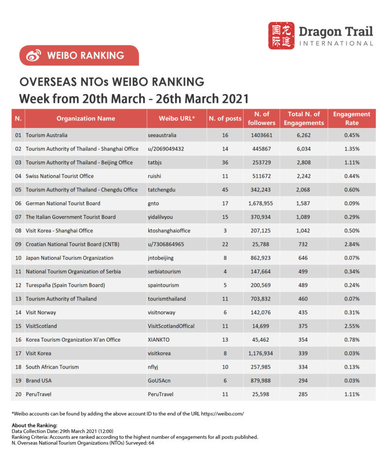 The top-ranking Weibo accounts for travel destinations, airlines, cruise lines, museums & attractions, and hotels, for the week of 20-26 March 2021.