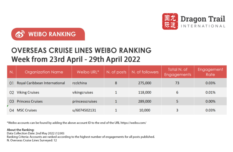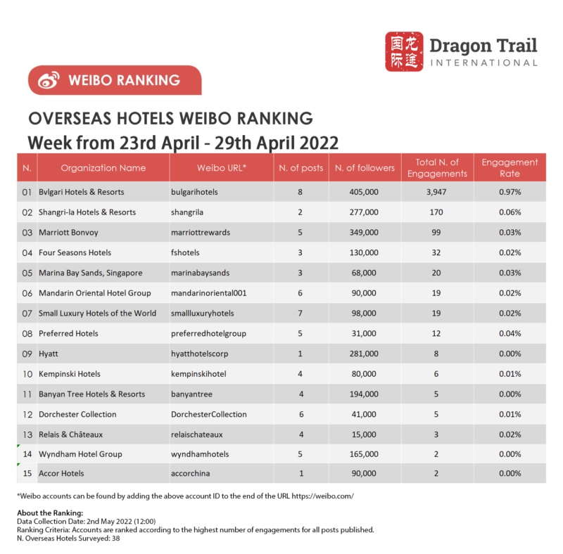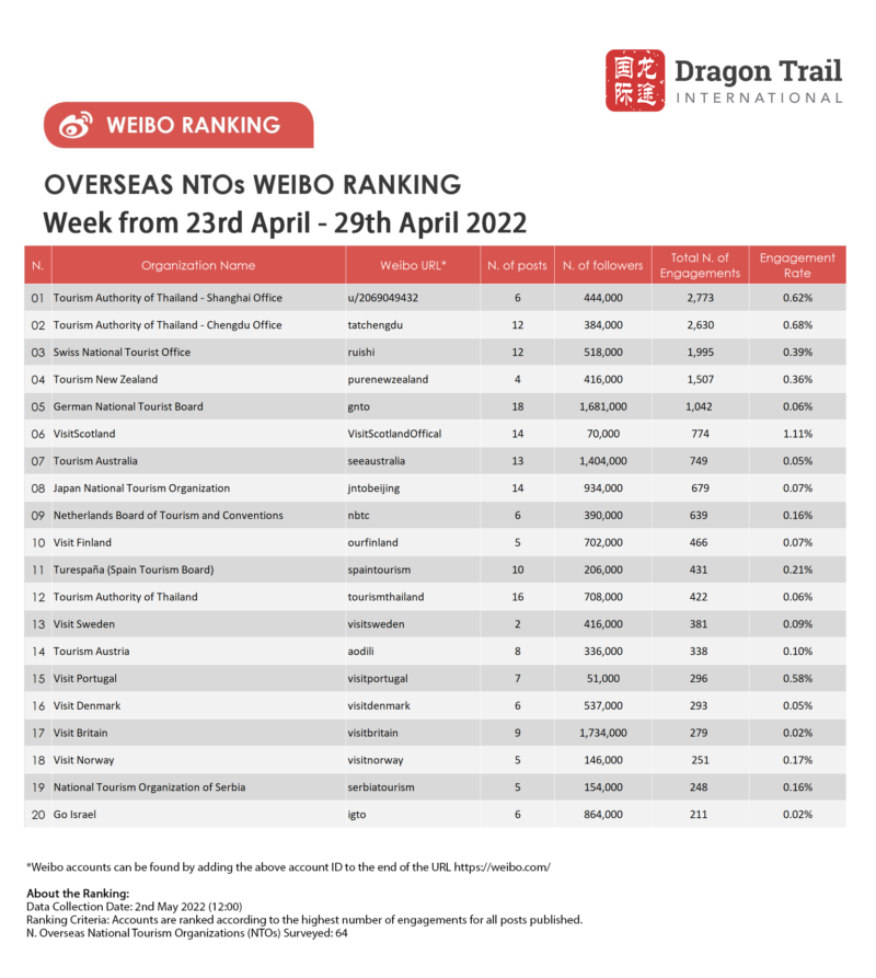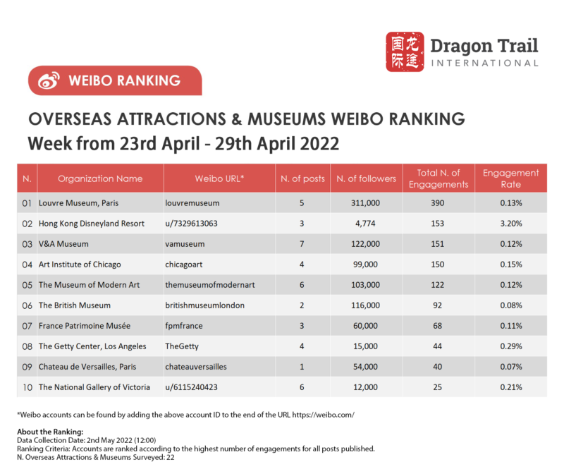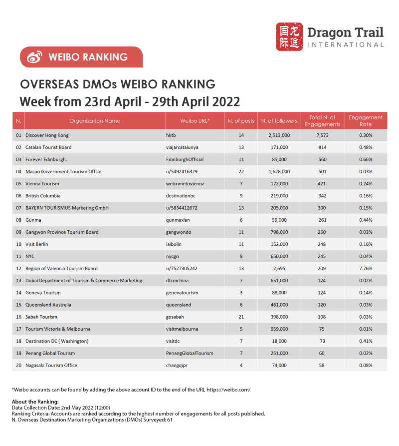 The top-ranking Weibo accounts for travel destinations, airlines, cruise lines, museums & attractions, and hotels, for the week of 23-29 April 2022.