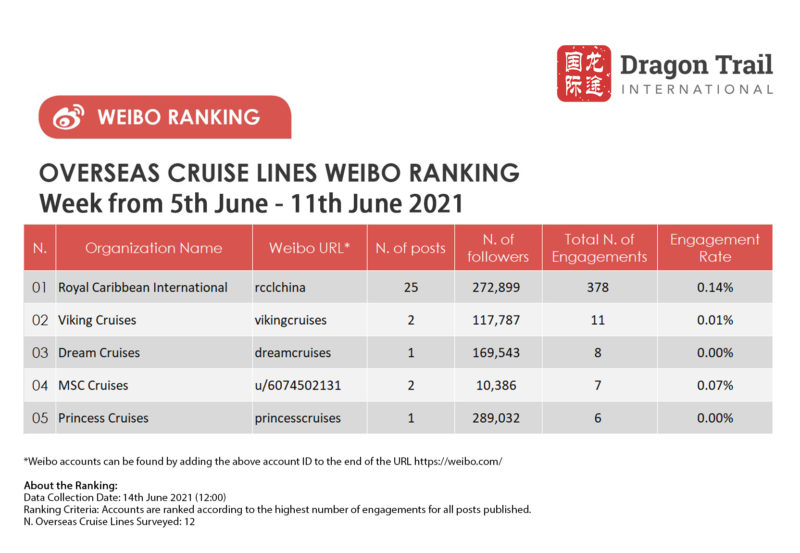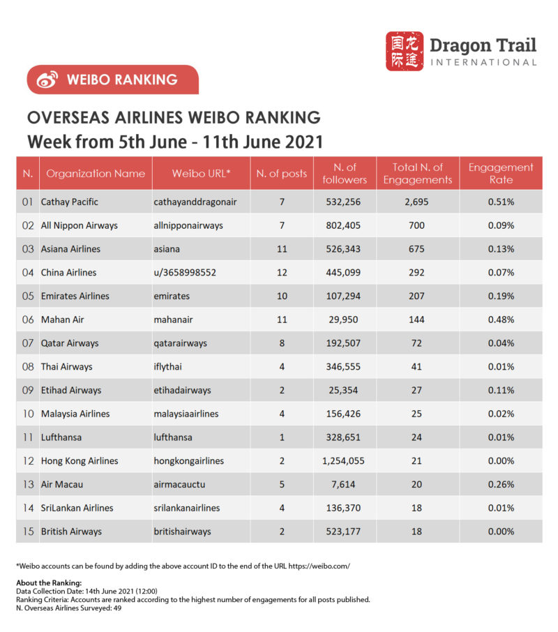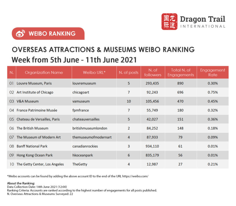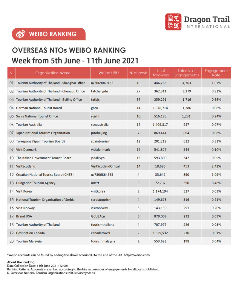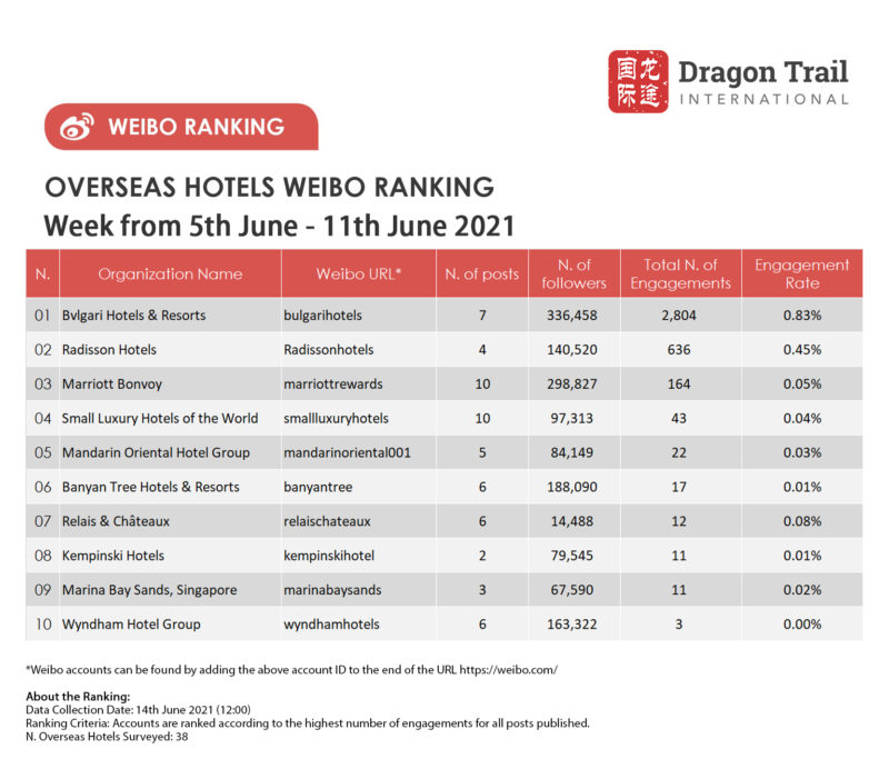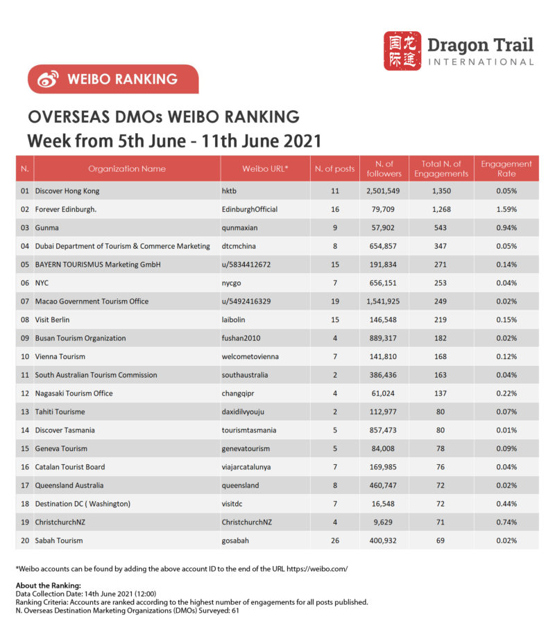 The top-ranking Weibo accounts for travel destinations, airlines, cruise lines, museums & attractions, and hotels, for the week of 5-11 June 2021.