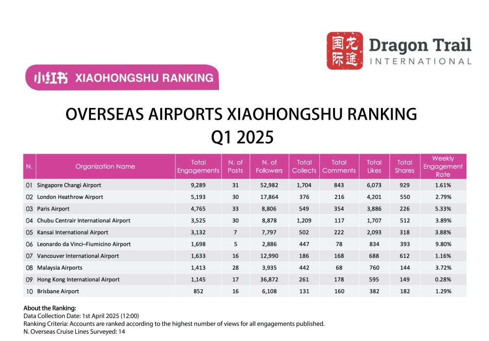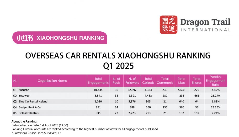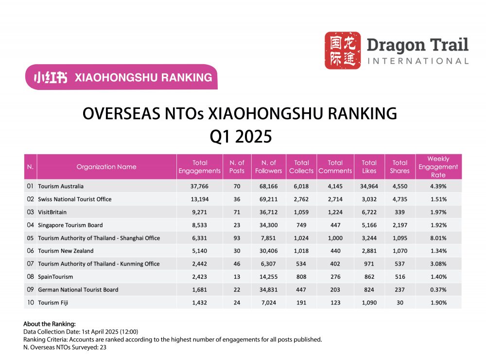 Dragon Trail International’s Xiaohongshu Rankings Report tracks and analyzes performance for national tourism organizations (NTOs), destination marketing organizations (DMOs), airlines, cruise lines, museums & attractions, and hotels. The quarterly Xiaohongshu report builds industry benchmarks and uncovers best practices in digital marketing in the travel sector.