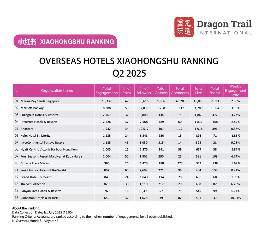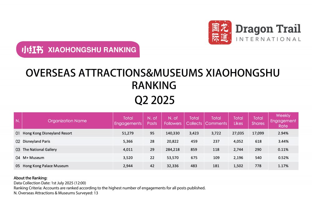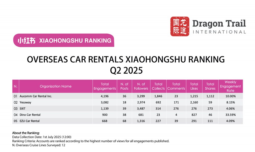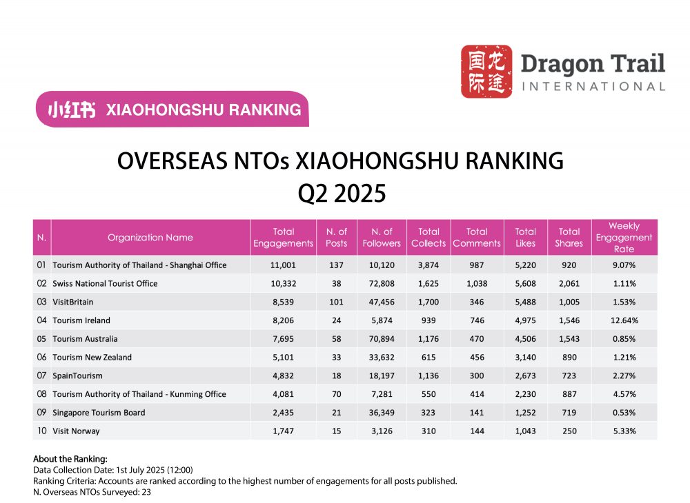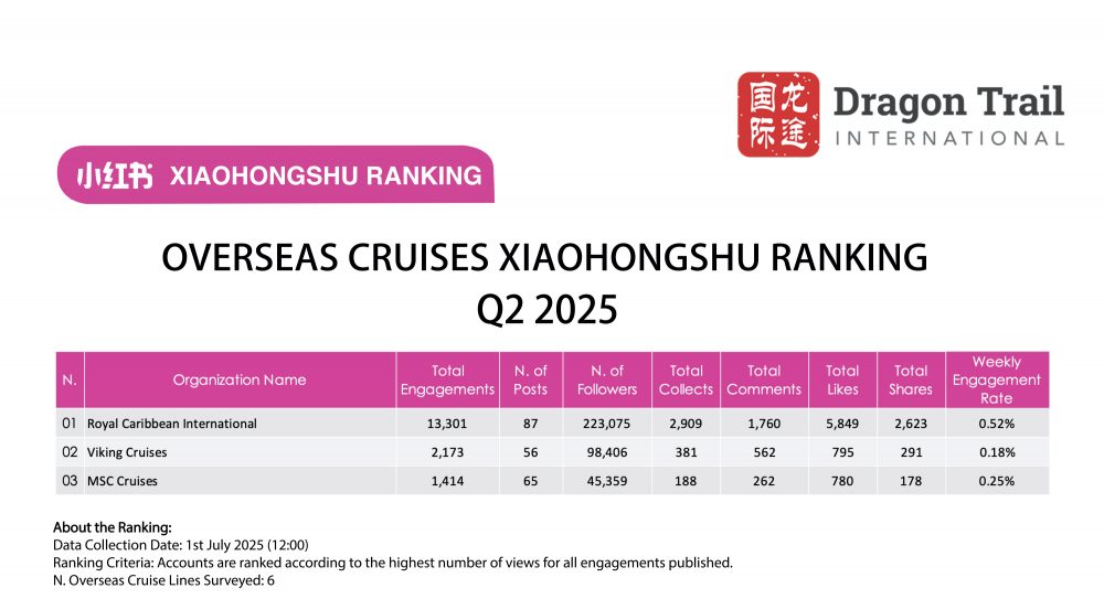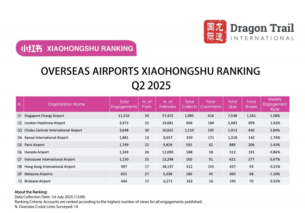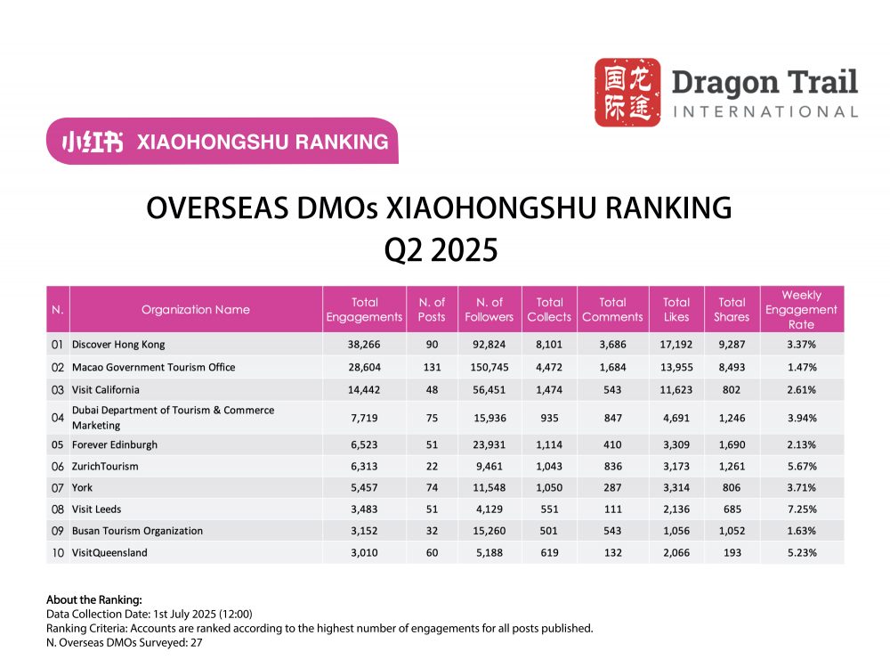 Dragon Trail International’s Xiaohongshu Rankings Report tracks and analyzes performance for national tourism organizations (NTOs), destination marketing organizations (DMOs), airlines, cruise lines, museums & attractions, and hotels. The quarterly Xiaohongshu report builds industry benchmarks and uncovers best practices in digital marketing in the travel sector.