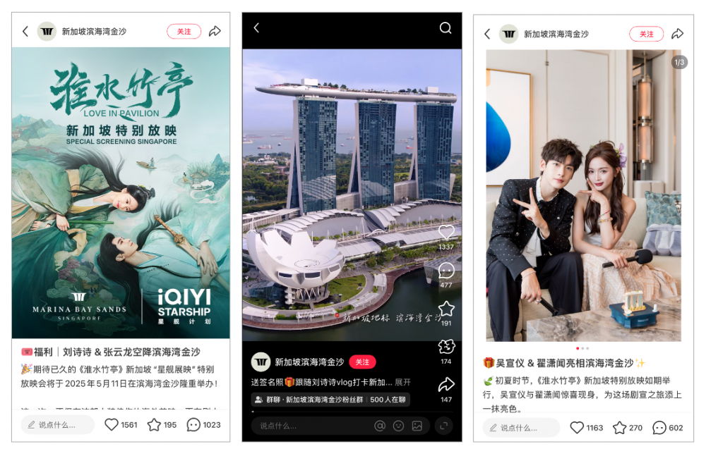 The top three posts from Marina Bay Sands documented a coordinated marketing campaign for the costume drama “Love in Pavilion,” which involved special overseas screenings and celebrity appearances. The strategy provided fans with exclusive behind-the-scenes content and ran high-value giveaways—such as premiere tickets, limited-edition dolls, and a signed photo of Liu Shishi—to drive online engagement and event attendance. Beyond leveraging star power and offering incentives, all three posts employed interactive, action-oriented calls-to-action by directly asking fans about their favorite scene from the drama, thereby prompting comments and fostering a sense of community.