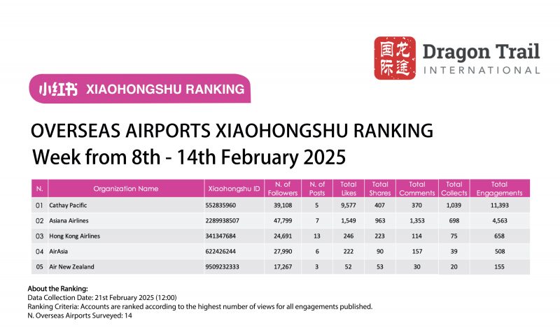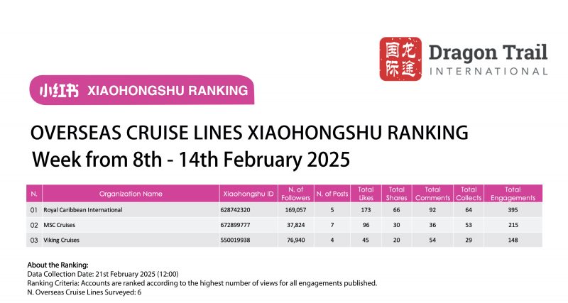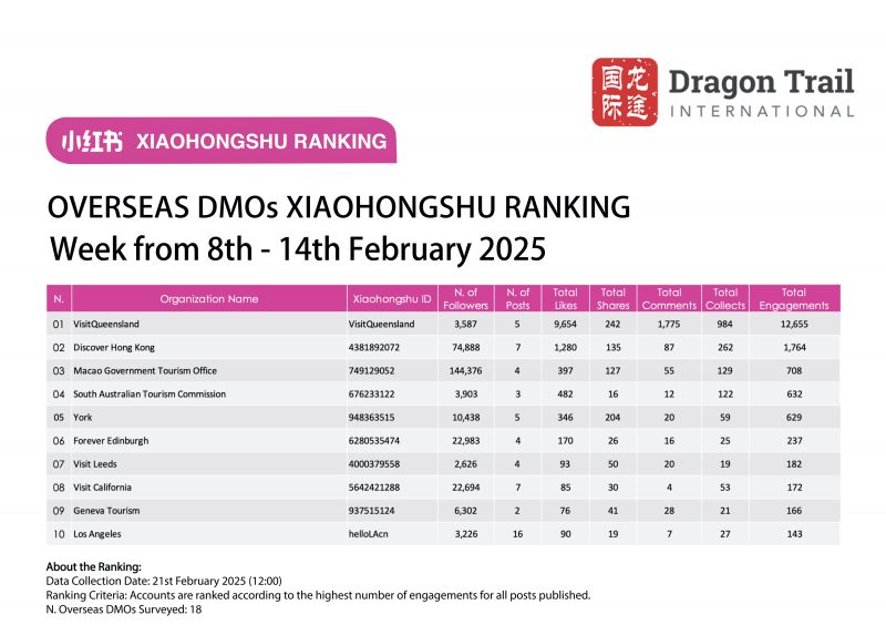 The top-ranking Xiaohongshu accounts for travel destinations, airlines, cruise lines, museums & attractions, and hotels, for the week of 8-14 February 2025.