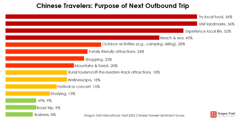 When asked about their purpose for traveling abroad, trying local food and visiting landmarks were the top priorities, with each chosen by 56% of survey respondents. 52% said they wanted to experience local life.