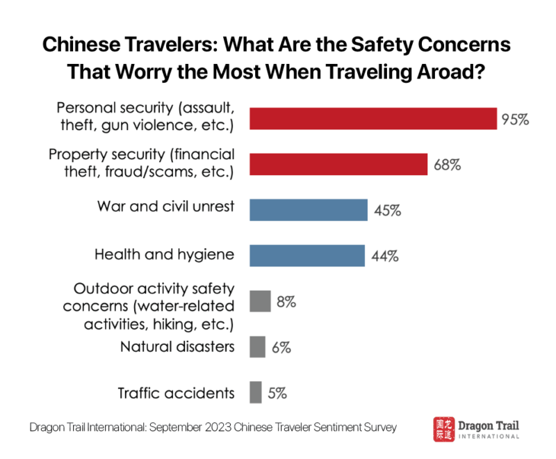 What does “safety” mean to Chinese outbound travelers? 95% said they worried about personal security, including theft and assault. These fears are an important motivation behind joining group tours, as well as buying travel insurance.