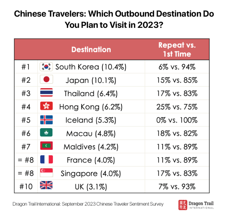 But what about Chinese travelers themselves? What are their plans and sentiments around outbound travel in the rest of this year and beyond? What is motivating their trips, or holding them back? From 4-11 August 2023, Dragon Trail Research surveyed 999 mainland Chinese travelers. The results of our survey reveal both consistencies – particularly in reasons for traveling outbound and destination information sources – and major changes in Chinese travelers’ outlook. Our resulting report is intended to illuminate these trends and help guide destinations and travel brands in their marketing, products, and services developed for Chinese outbound travelers.