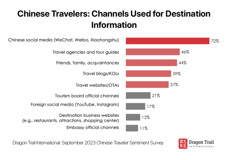 72% of survey respondents looked to Chinese social media platforms like WeChat, Weibo, and Xiaohongshu for information on outbound travel destinations. The other most trusted information sources included travel agents and tour operators, friends and family, and KOLs and travel websites.