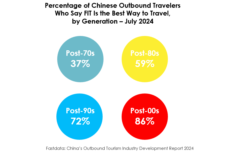 Compared to travelers born in the 1970s and ‘80s, those born in the 1990s and 2000s are more likely to believe that independent travel is superior to group travel, with more flexibility and offering a unique travel experience. Additionally, more travelers are considering FIT than ever before. Among those who traveled as part of a group in 2023, 42.9% said they would choose FIT for their next outbound trip, with 57.1% saying they would again choose group travel. The report also highlights the growth of “Group + Independent” travel, whereby transport to the destination and accommodation is taken care of as part of a group package, but travelers are independent at the destination, organizing their own daily itineraries and meals.