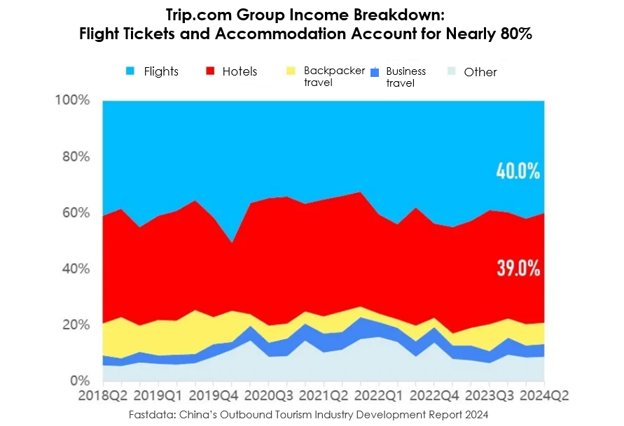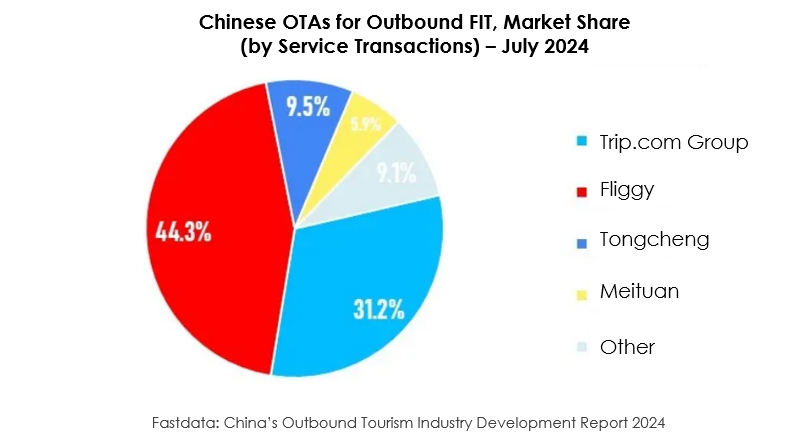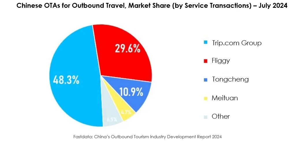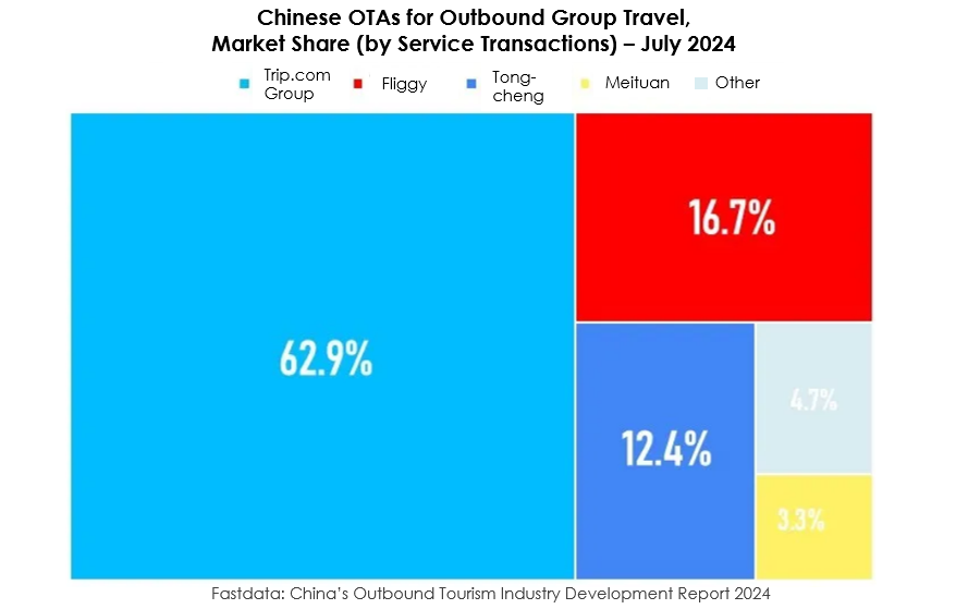 Trip.com Group (Ctrip + Qunar) accounts for nearly half of the market, but Fliggy has grown to almost one-third and ranks second. For group travel, Trip.com Group is more dominant, accounting for 62.9% of the market.