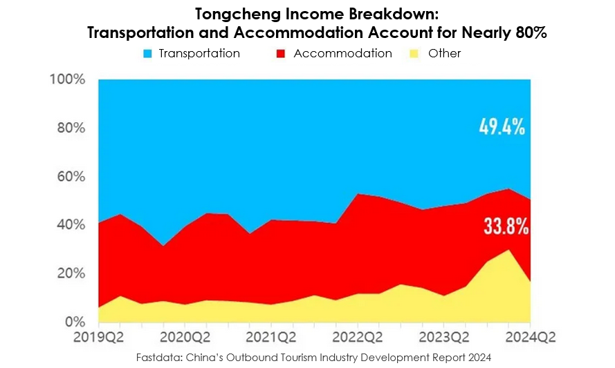 Tongcheng’s (including Elong) strength comes from being integrated into the WeChat ecosystem, with some integration with Ctrip as well. Transportation bookings make up nearly half of their income.