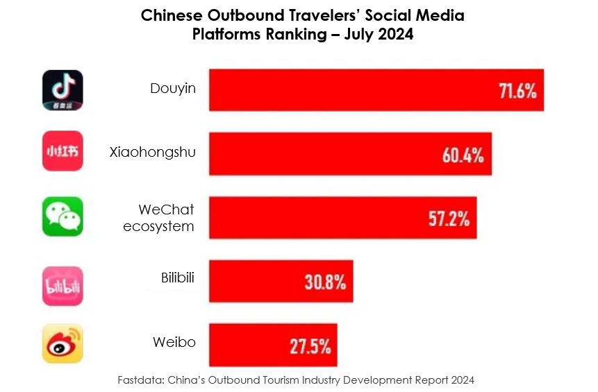 Social media is the most important channel for outbound travel inspiration, followed by OTAs. Douyin, Xiaohongshu, and WeChat are the three top social media platforms for outbound travel inspiration.